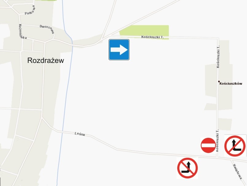 Zmiana organizacji ruchu polega na ustawieniu znaku informacyjnego D-3 (droga jednokierunkowa) na ul. Kościuszki od strony ul. Pleszewskiej w kierunku ul. Leśnej, oraz znaku B–2 (zakaz wjazdu) z ul. Leśnej w ul. Kościuszki. Na ul. Leśnej przy skrzyżowaniu z ul. Kościuszki ustawione są znaki B-21 i B-22 (zakaz skrętu). Zmiana czasowa organizacji ruchu obowiązuje w dniu 1 listopada 2017 r.