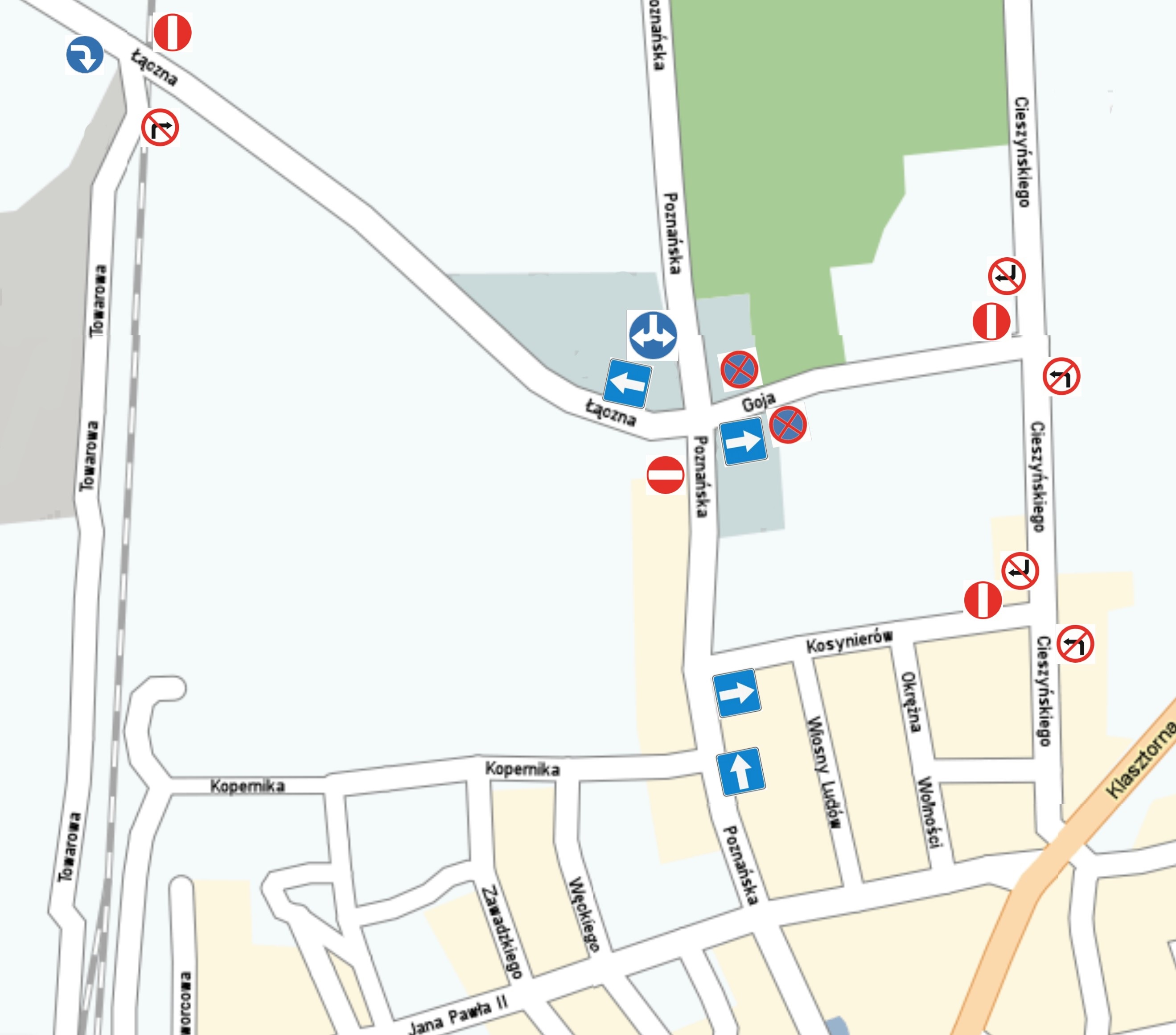 Zmiana organizacji ruchu polega na ustawieniu znaku informacyjnego D-3 (droga jednokierunkowa) na ul. Poznańskiej od skrzyżowania z ul. Kopernika do skrzyżowania z ul. Łączną i ul. Stanisława Goja. Ulica Łączna będzie ulicą jednokierunkową od ul. Poznańskiej do ul. Towarowej. Od Białego Dworu będzie ustawiony znak C-2 (nakaz jazdy w prawo za znakiem) w ul. Towarową. Ulica Stanisława Goja będzie ulicą jednokierunkową od skrzyżowania z ul. Poznańską do ul. Cieszyńskiego. Na ul. Stanisława Goja będzie obowiązywał zakaz zatrzymywania i postoju po obu stronach ulicy.